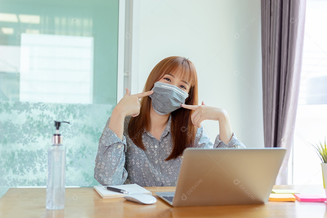 Mulher asiática usando máscara desinfetante para limpeza de álcool em gel