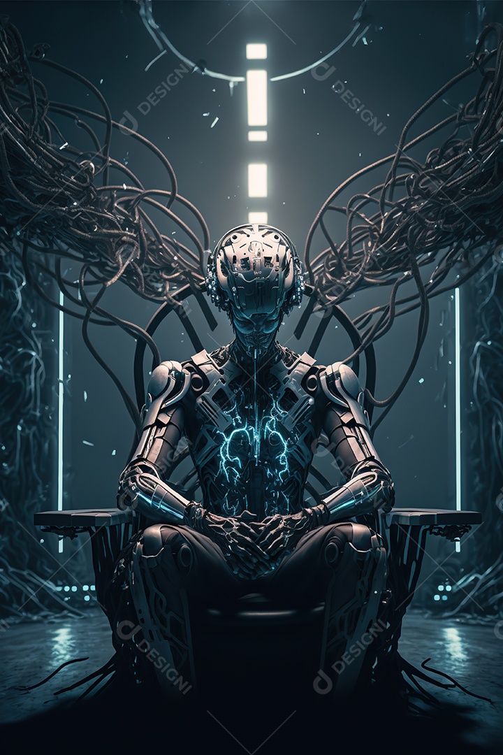 Homem com um capacete tecnológico sentado em uma pesada cadeira cibernética. Futurista, fantasia.