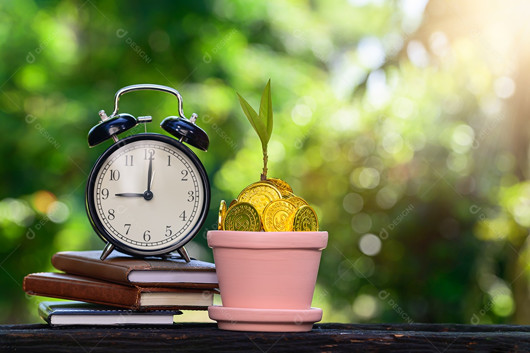 Planta crescendo em moedas de poupança fundo verde Bokeh com luz do...