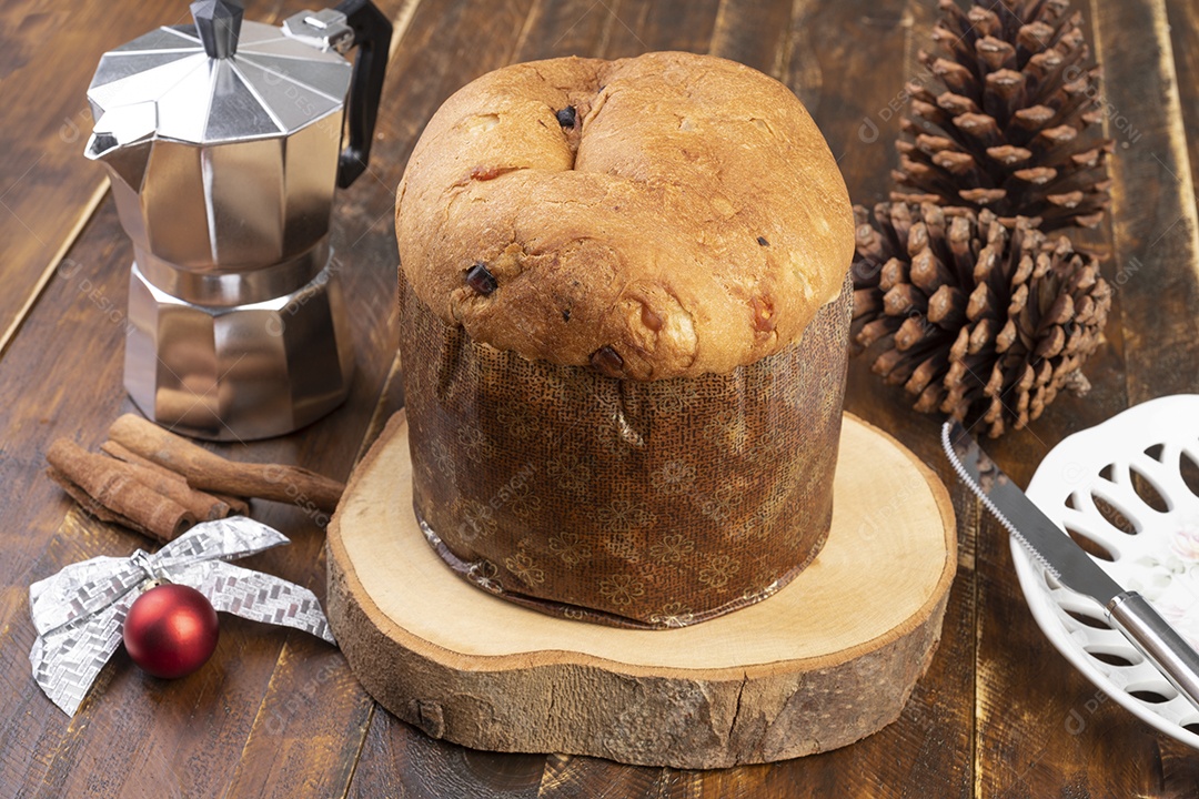 Panetone de bolo de frutas de natal italiano tradicional sobre tábua de madeira.