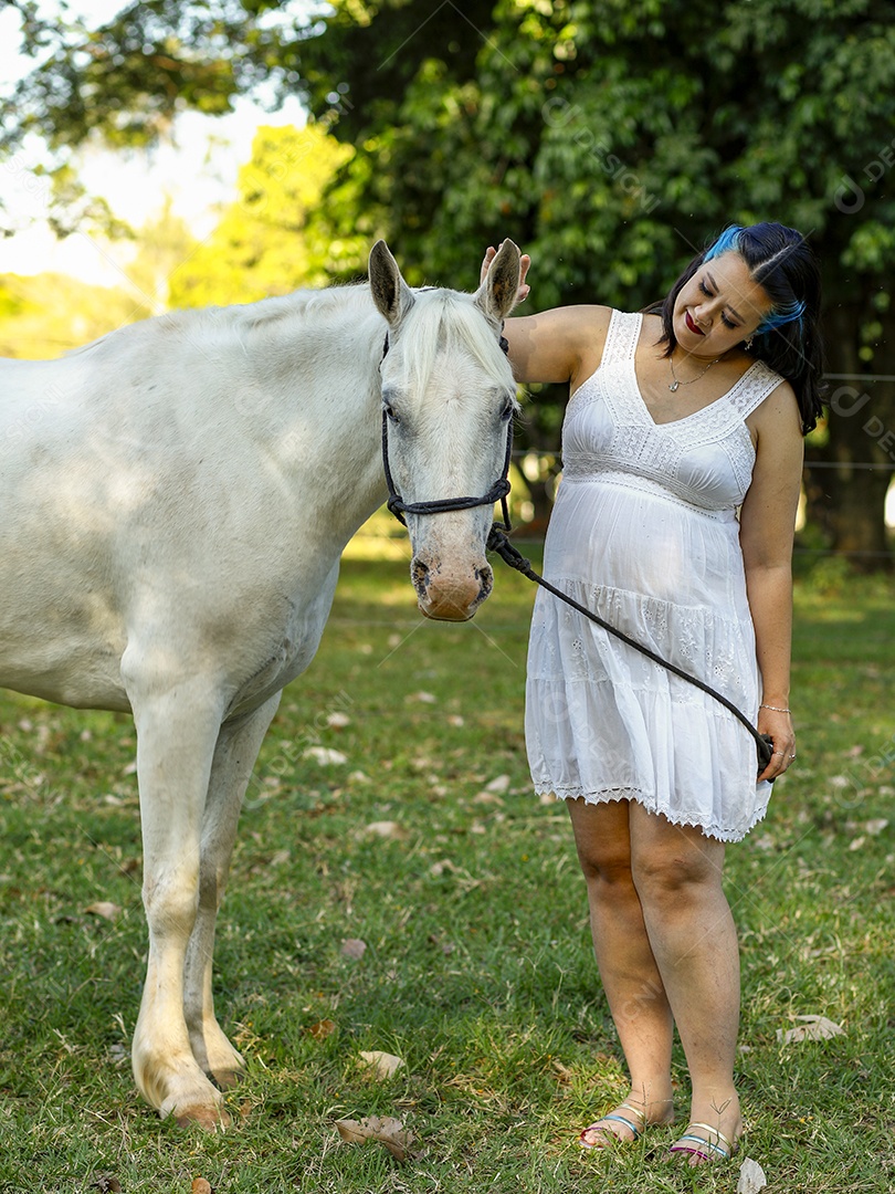 Linda mulher gravida jovem ao lado de seu cavalo fazenda