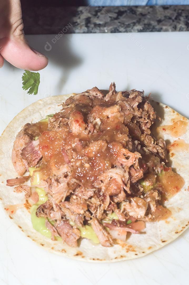 Espetinho de porco desfiado com tortilha, guacamole e fundo de maemore