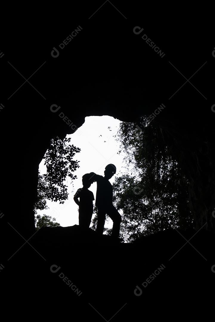 Vista dos irmãos na entrada de uma caverna no Brasil.