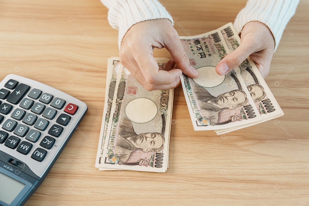 Mão de mulher contando notas de ienes japoneses com calculadora.