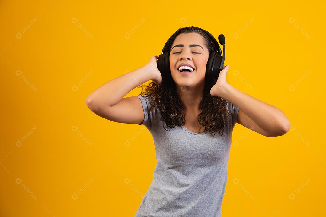 Mulher excitada ouvindo música em fones de ouvido.