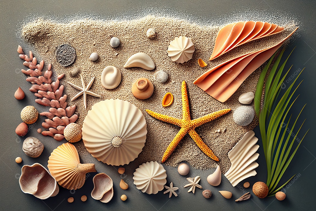 Fundo temático de praia com conchas e estrelas do mar gerado por IA