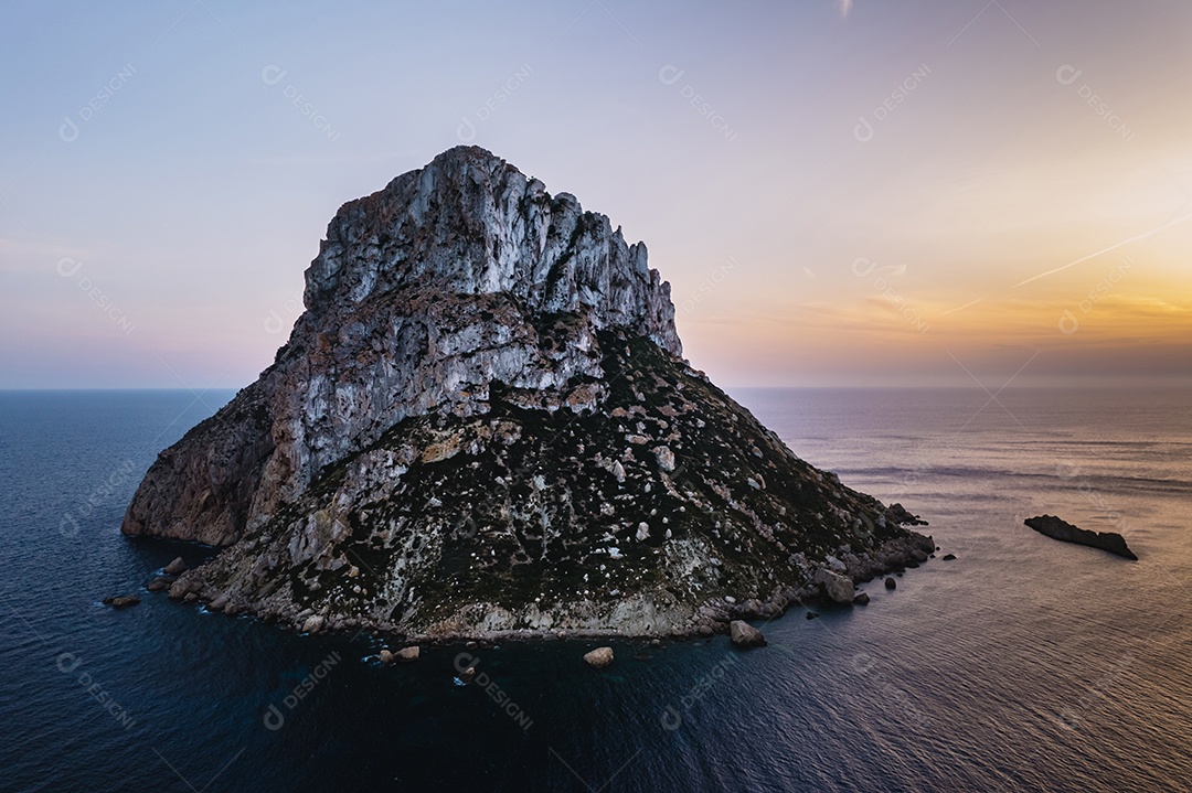 Vista aérea de Espanha Vedra Ibiza durante o pôr do sol. Mostrando oceano e céu claro.