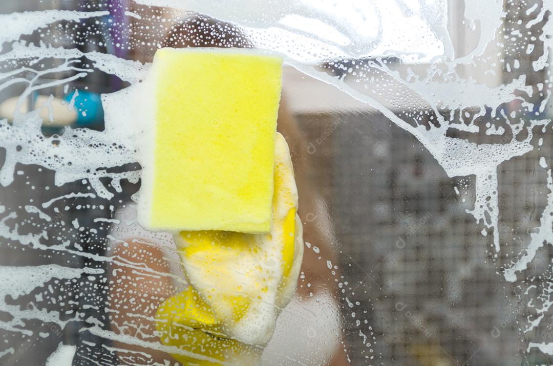 Grande conceito de limpeza doméstica, jovem loira limpando vidro do...