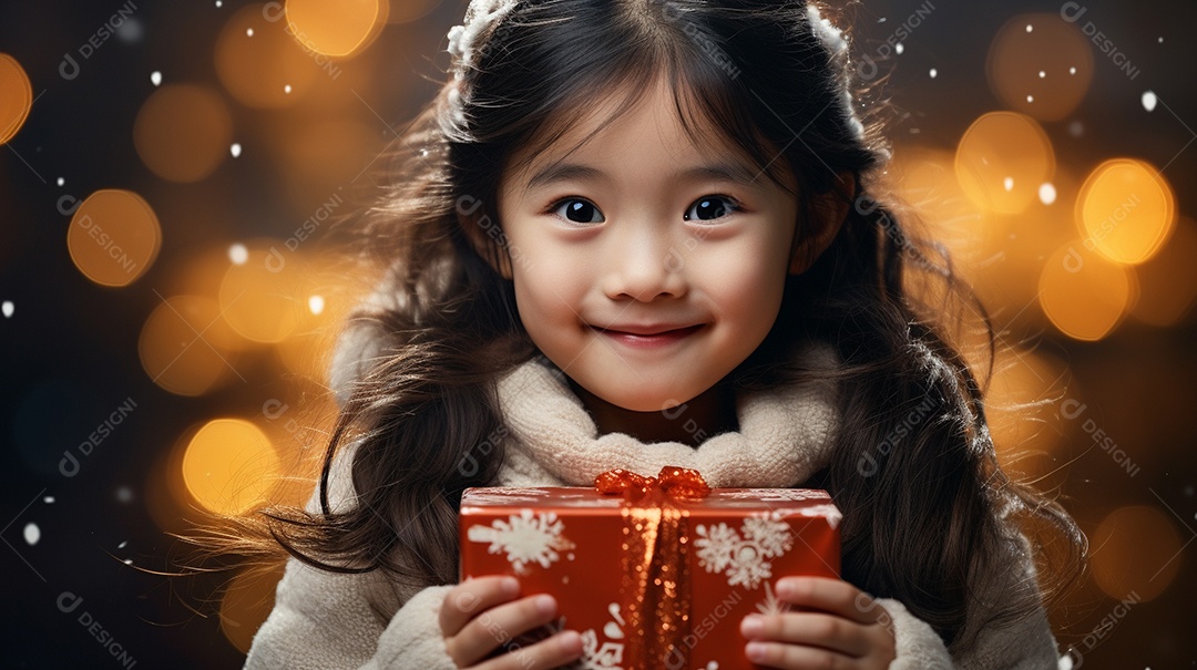 Retrato de uma linda garotinha asiática com uma caixa de presente