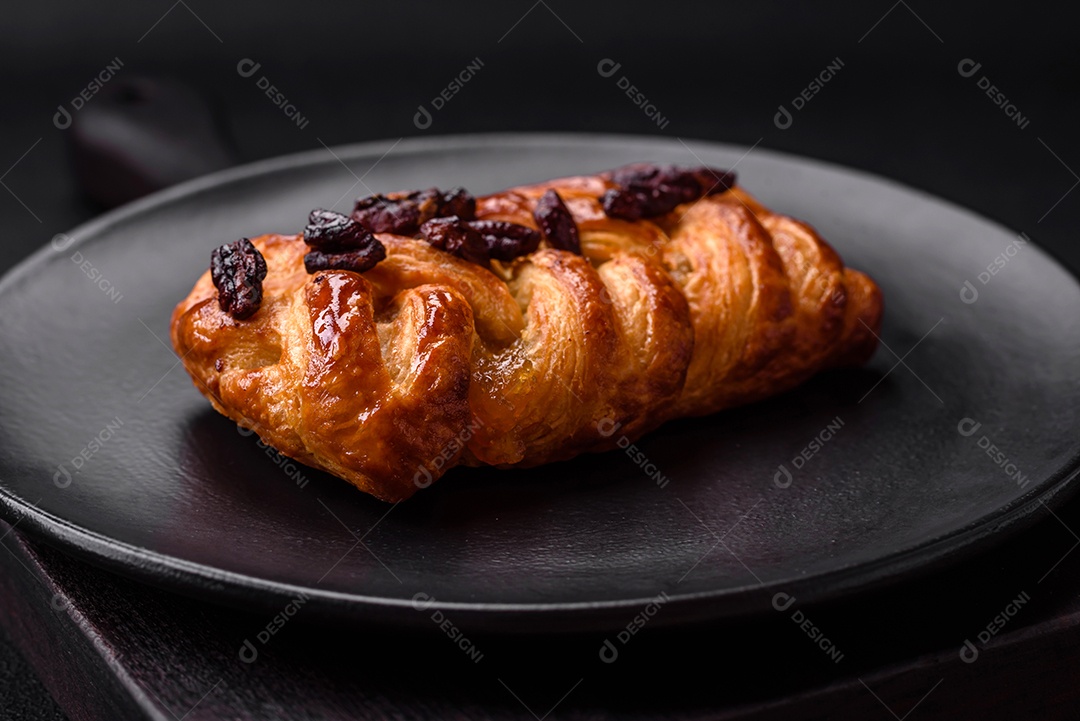 Delicioso pão de trança recém-assado com nozes e xarope sobre um fundo escuro de concreto