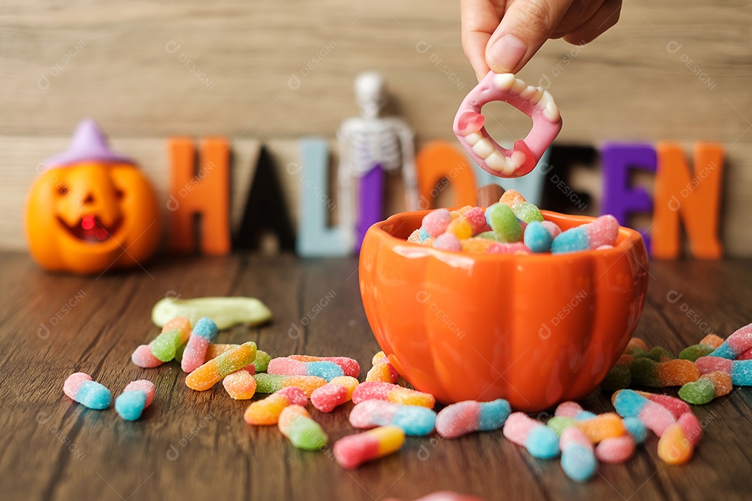Feliz dia de Halloween com doces fantasmas, tigela de abóbora, Jack...