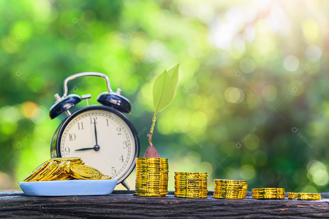 Planta crescendo em moedas de poupança fundo verde Bokeh com luz do...