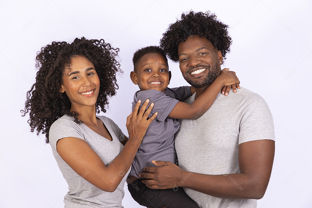 Mãe e pai feliz ao lado de seu filho sobre fundo isolado branco