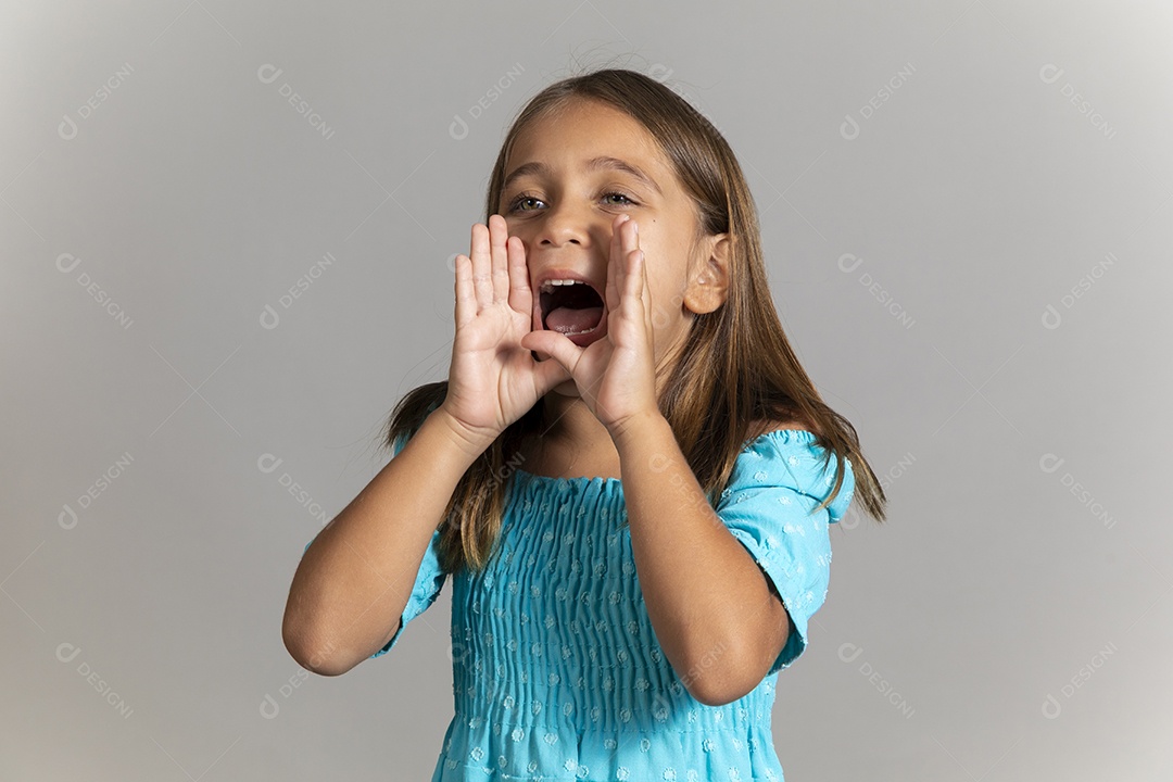 Linda garotinha usando vestido longo azul fazendo gesto de grito so...