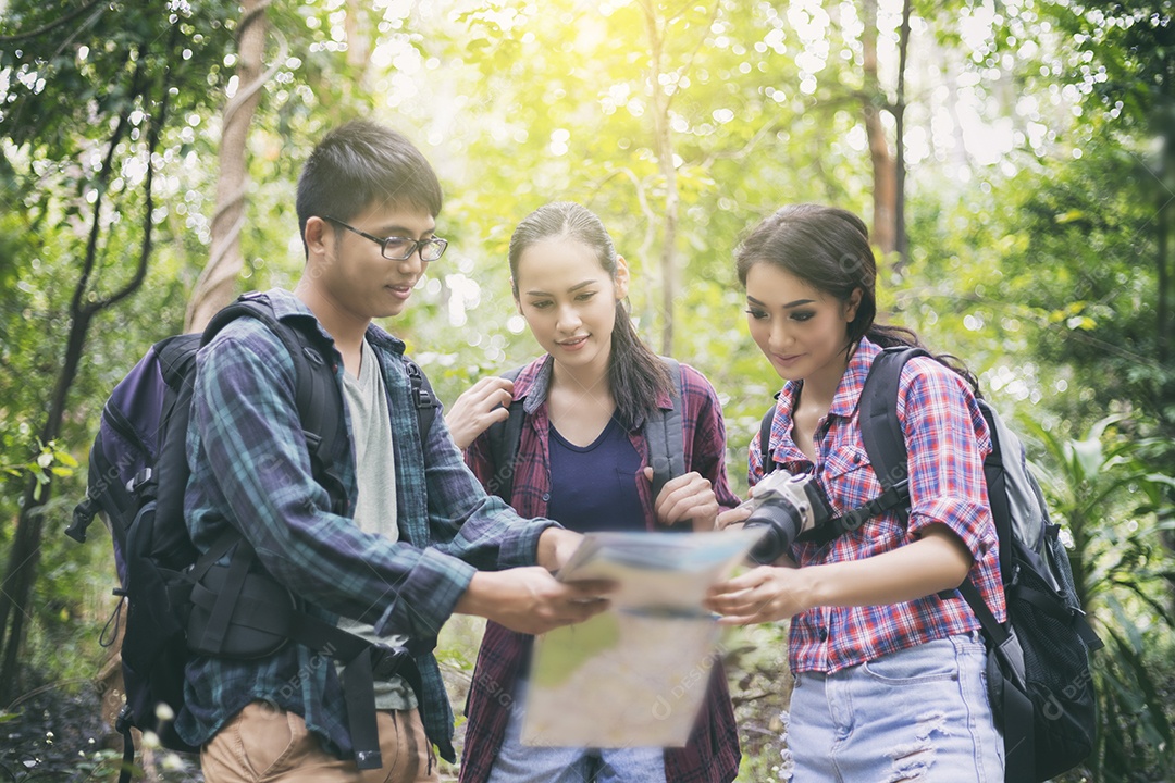 Grupo asiático de jovens Caminhando com mochilas de amigos caminhan...