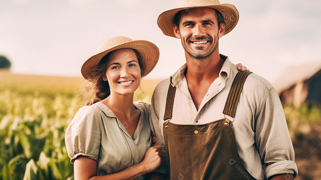 Homem e mulher agricultores chapéu de palha em pé terras agrícolas sorrindo
