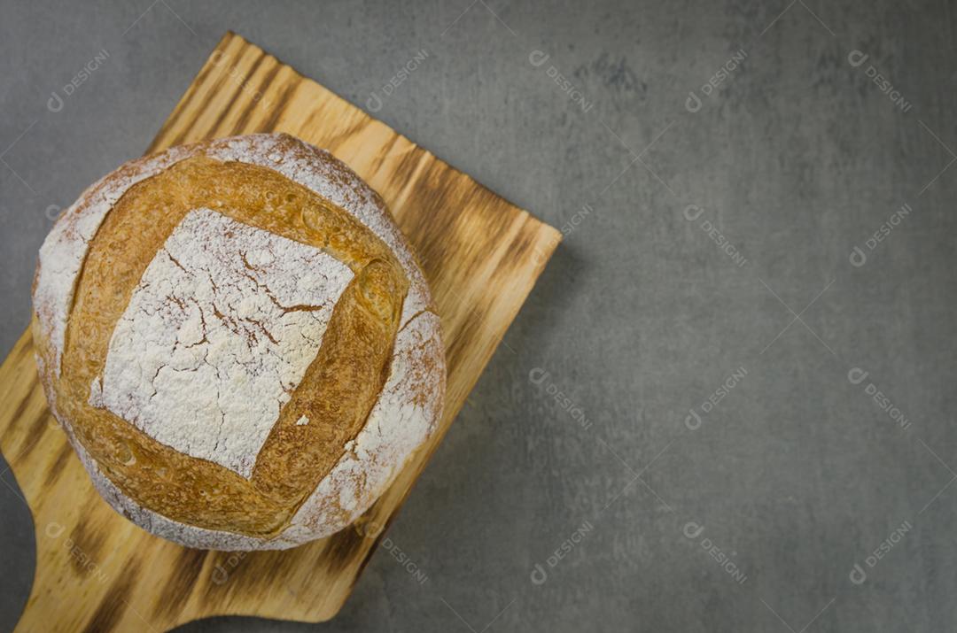 Belo pão de fermento em fundo cinza com flor de trigo seca.