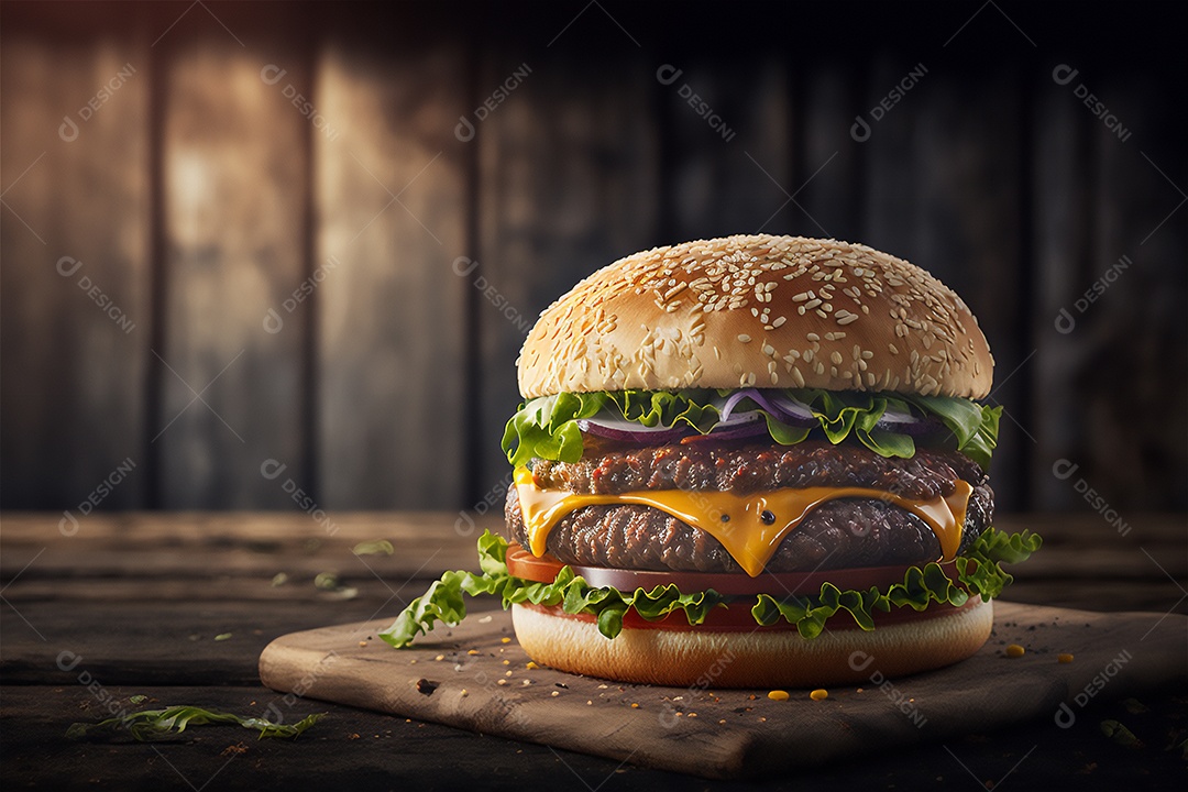 Saboroso hambúrguer caseiro na mesa de madeira rústica Anúncio Lanche de fast-food.
