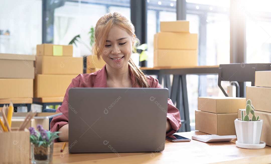 Jovem linda e feliz empresária asiática proprietária de pequena empresa online