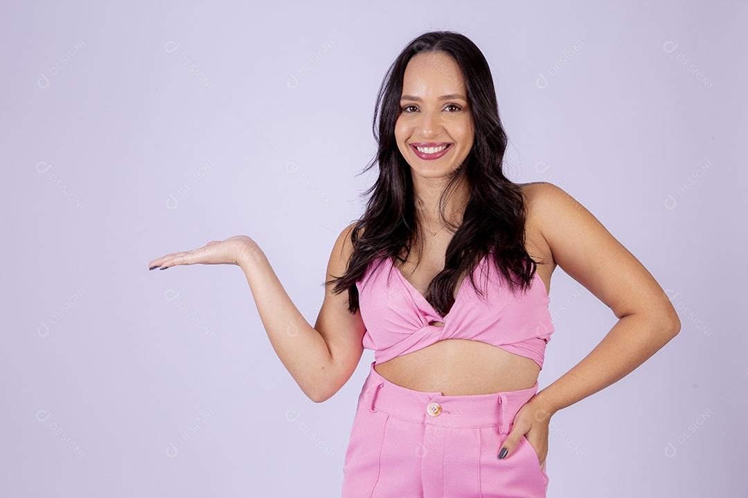 Linda mulher sorridente no estúdio em fundo branco