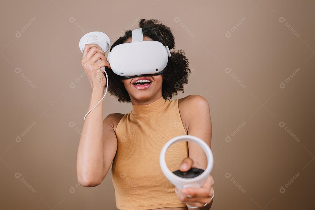 Jovem latina em pé com óculos de realidade virtual e mantenha joyst...
