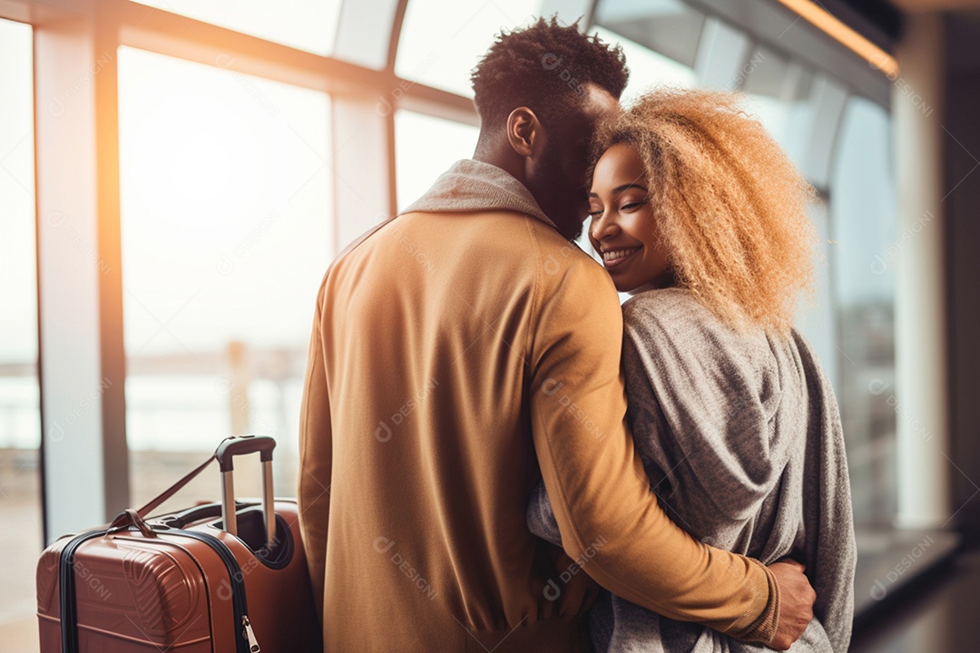 Casal apaixonado se abraçando esperando embarque