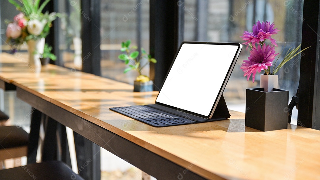 Foto recortada de Laptop com notebooks e estacionário em uma mesa d...