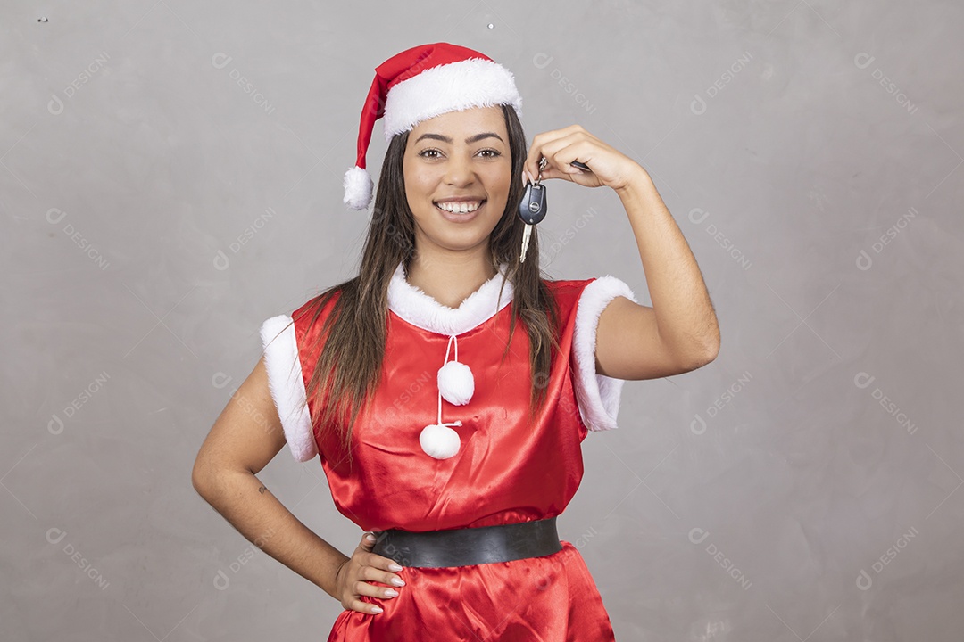 Mulher jovem vestida de Papai Noel segurando um chave de uma automóvel