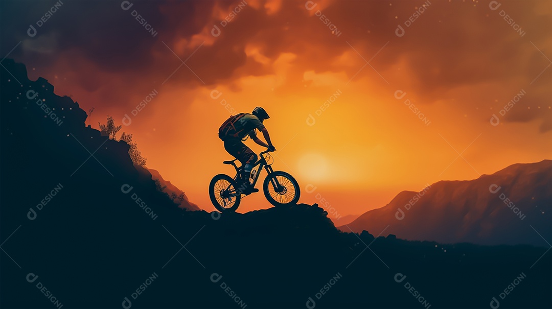 Silhueta de um ciclista de montanha em um fundo por do sol.