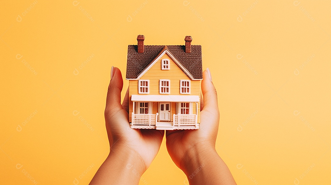 Casa em miniatura isométrica nas mãos de uma mulher isolada no fund...
