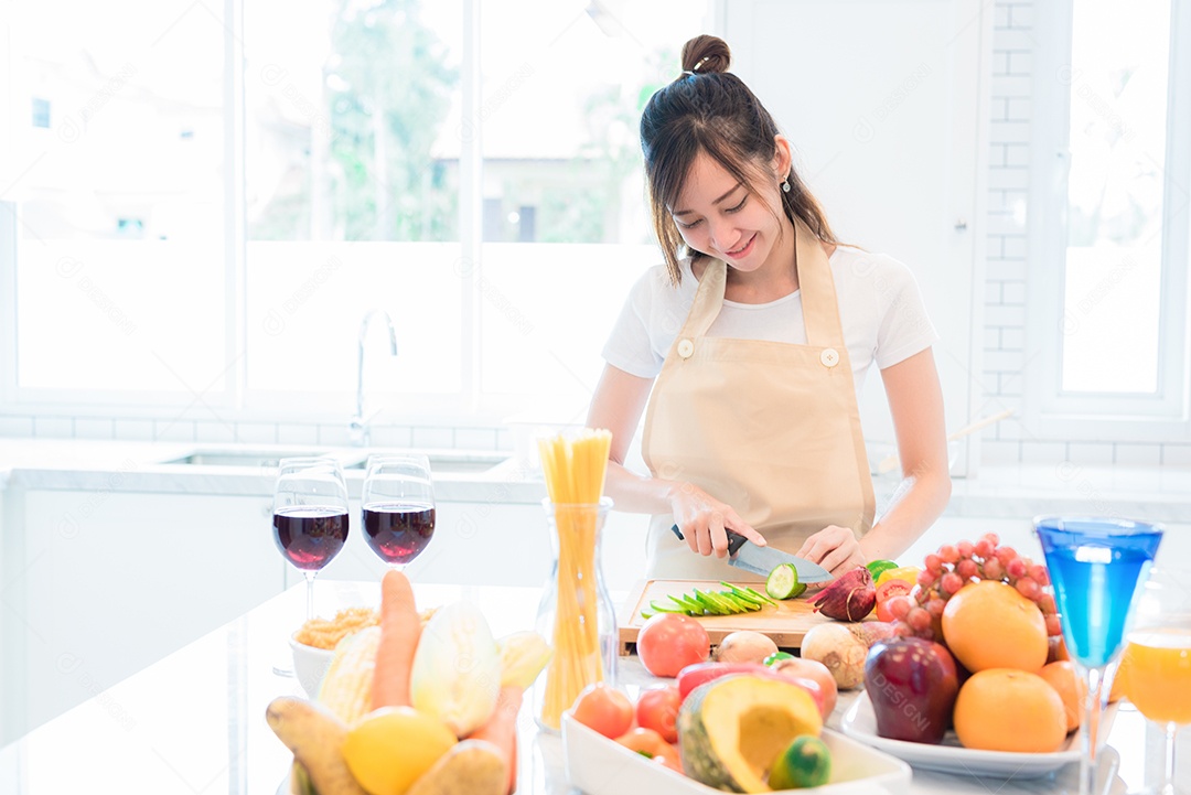 Mulher cozinhando e cortando vegetais na sala da cozinha cheia de comida e frutas na mesa. Conceito de férias e felicidade.