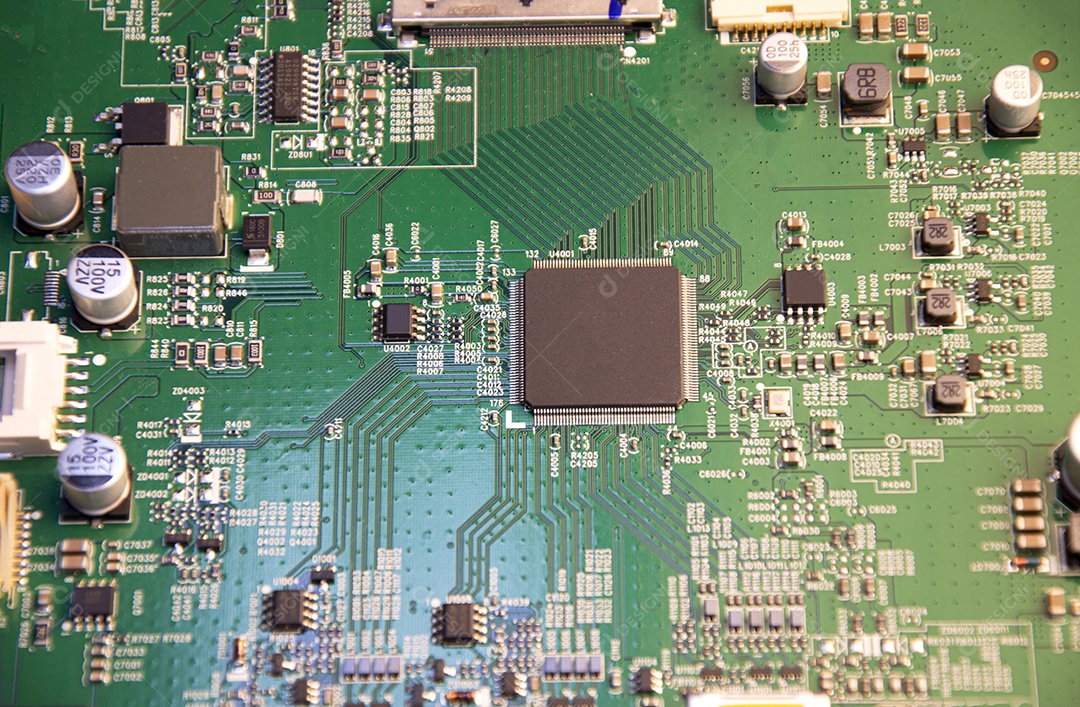 Vista superior da placa mãe e do técnico prestes a inserir o chip d...