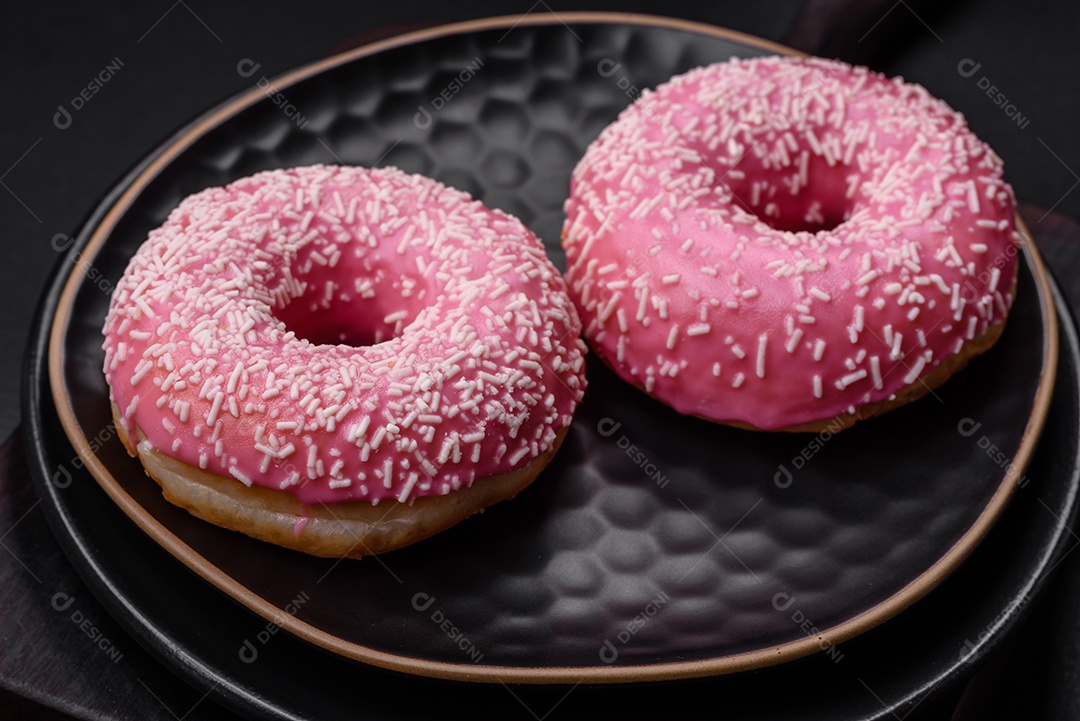 Deliciosos donuts doces frescos em esmalte rosa com recheio de morango sobre um fundo escuro de concreto