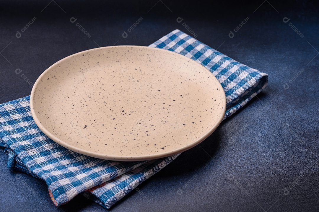Placa cerâmica colorida vazia redonda em fundo de textura de concreto. Preparando pratos e talheres para o jantar