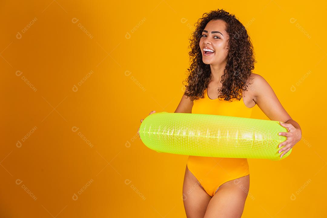 Jovem de maiô segurando flutuador verde com cara de feliz em pé e s...