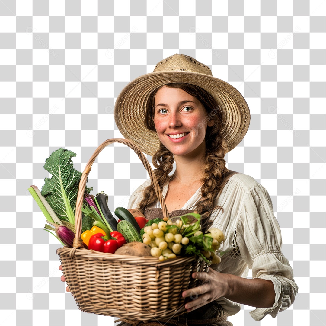Mulher Fazendeira com Cesta de Frutas e Legumes PNG Transparente