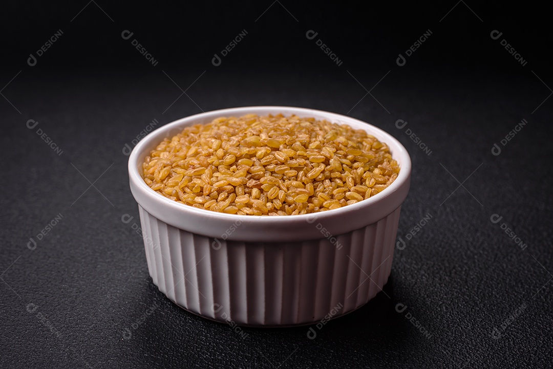 Os grãos de trigo Bulgur são amarelos quando crus. Cozinhando um de...