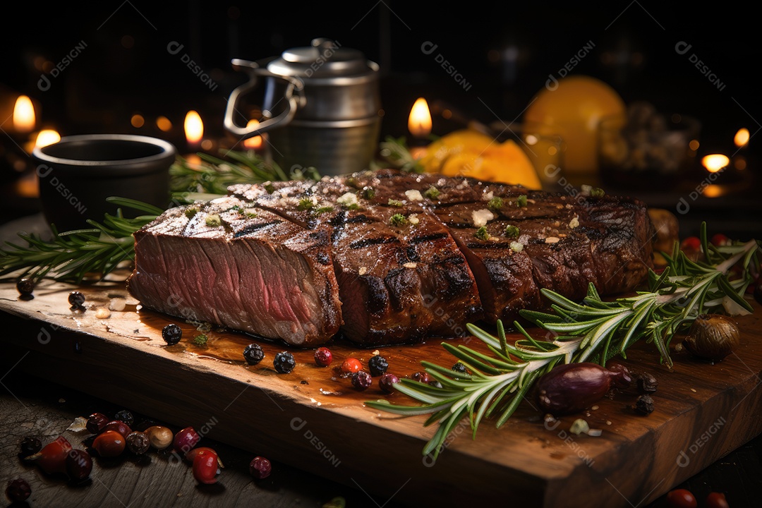Picanha grelhada suculenta com cebolas caramelizadas e ervas frescas.