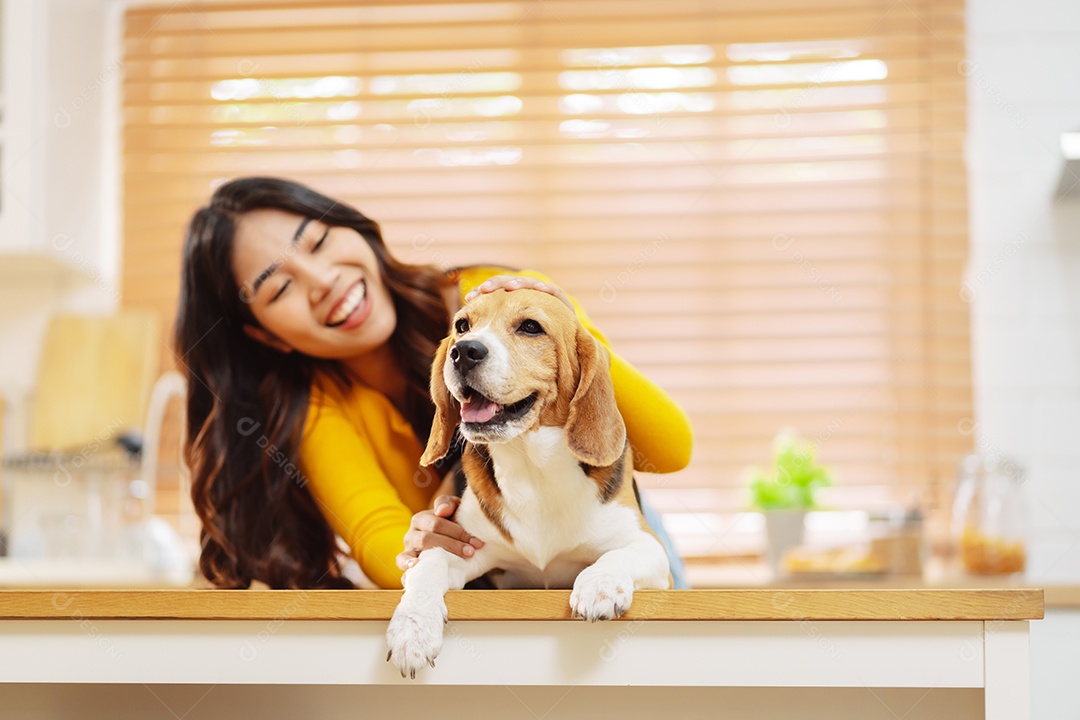 Mulher asiática feliz desfrutando de seu cão de estimação em casa