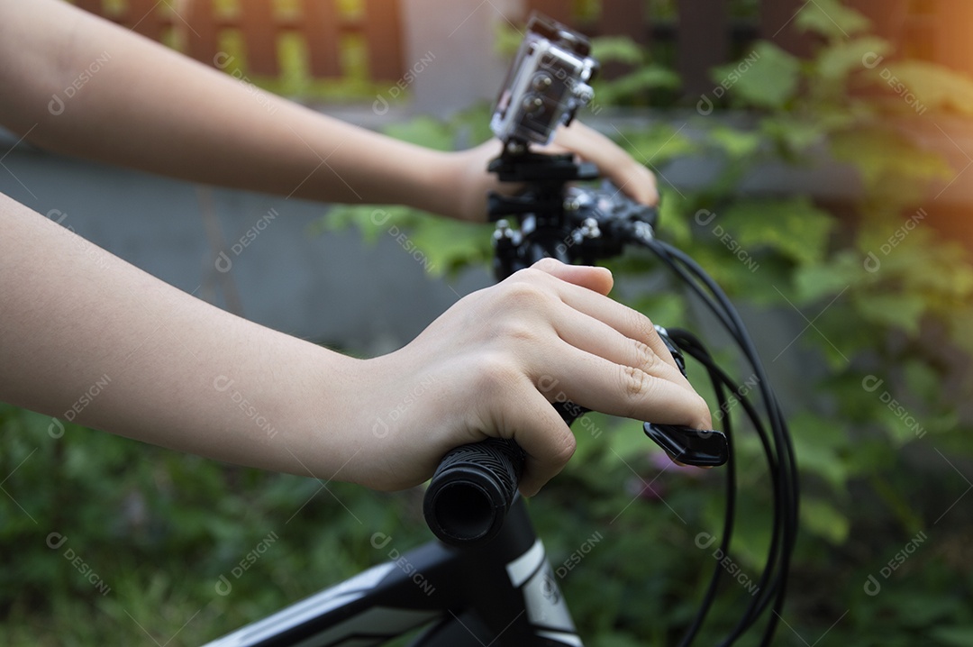 Mão de uma mulher segurando o guidão de uma mountain bike