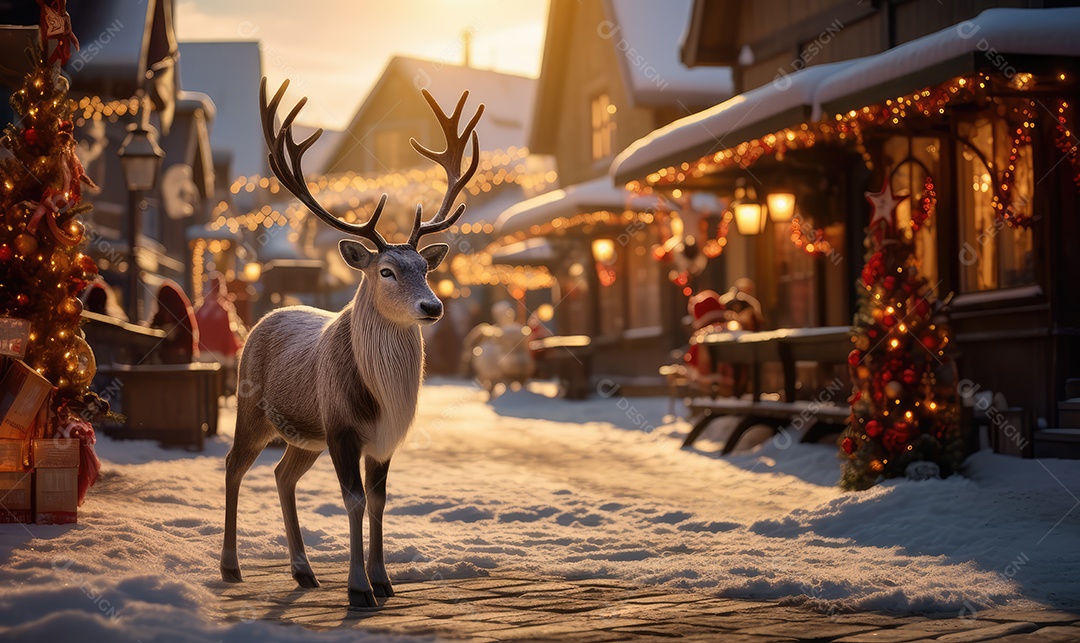 Uma rena em frente à bela vila de casas na neve decorada para a véspera de Natal