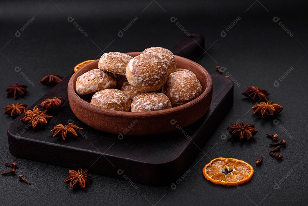 Delicioso pão de gengibre redondo doce com geleia dentro sobre um fundo escuro de concreto