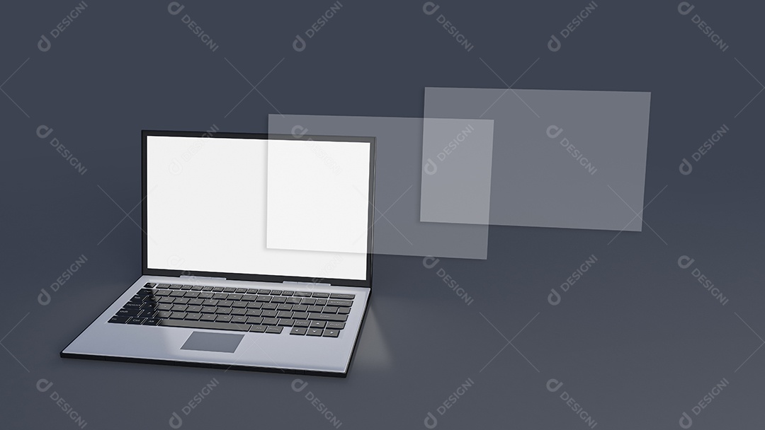 Imagem de renderização 3D do laptop em fundo cinza escuro.