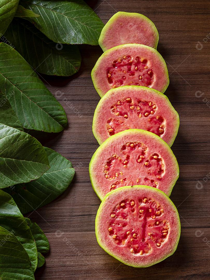 Linda goiaba vermelha fresca, fruta de outono em fundo rústico de m...