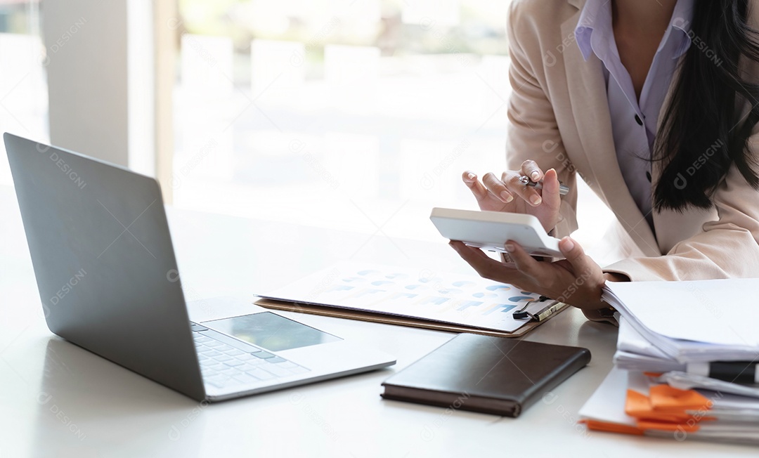 Mão de empresária segurando uma caneta apontando para um gráfico