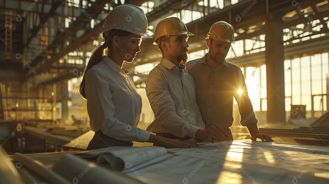 Equipe de engenheiros engajados, trabalhando em torno de uma mesa de conferência com plantas