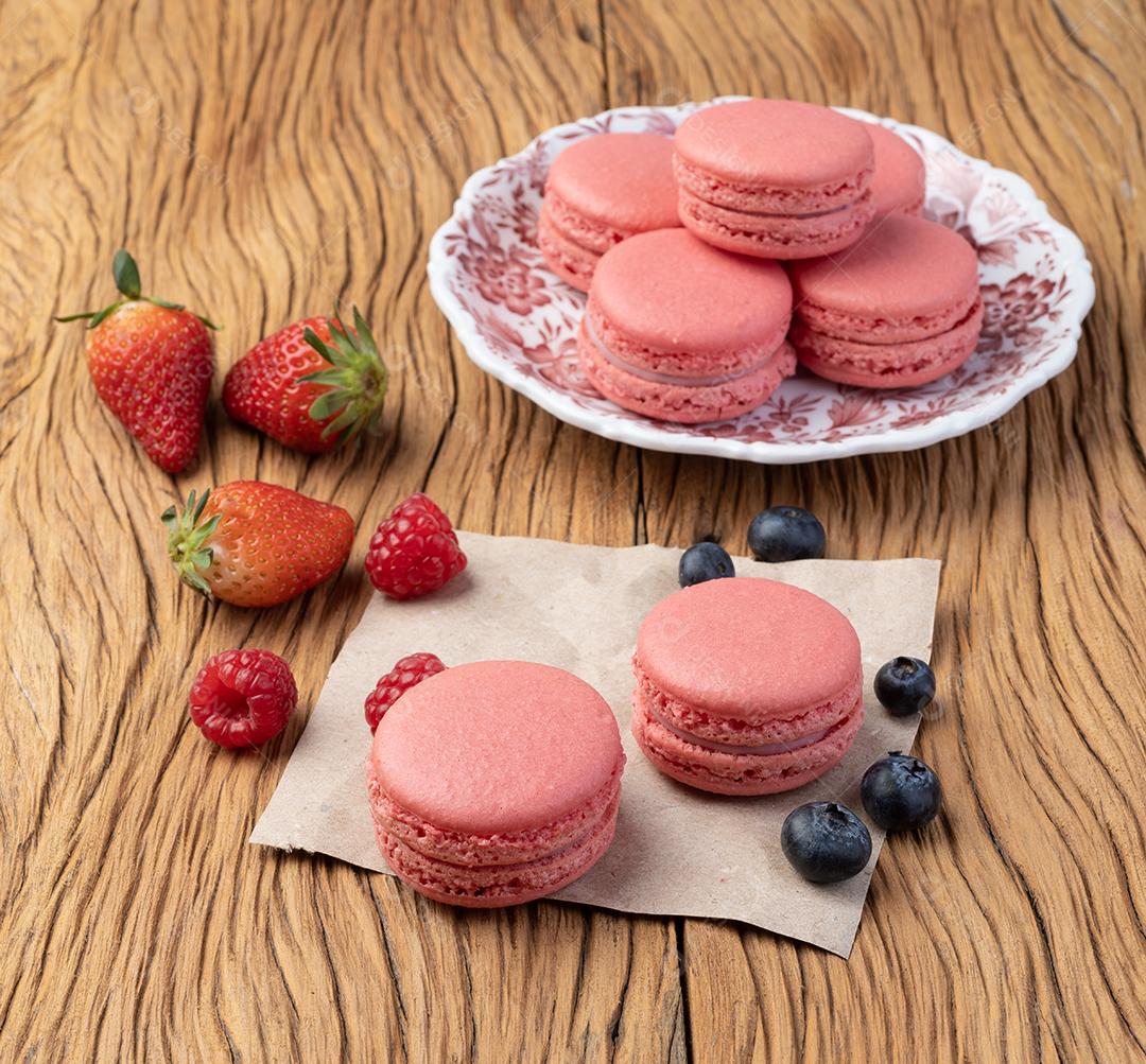 Macarons de Berry com morangos, framboesas e mirtilos sobre a mesa de madeira.
