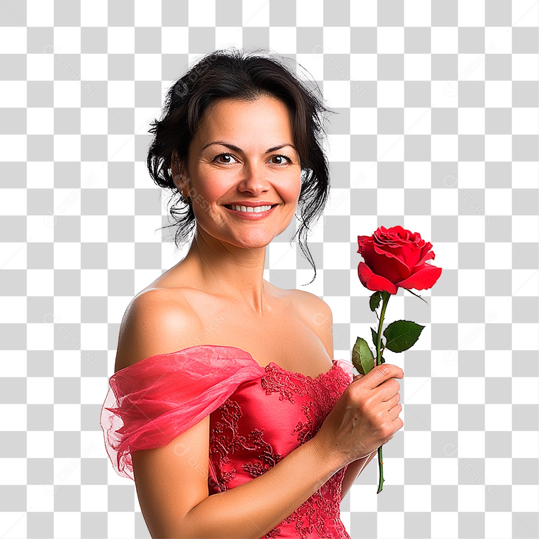 Mulher De 40 Anos Usando Vestidos Rosa segurando Rosa