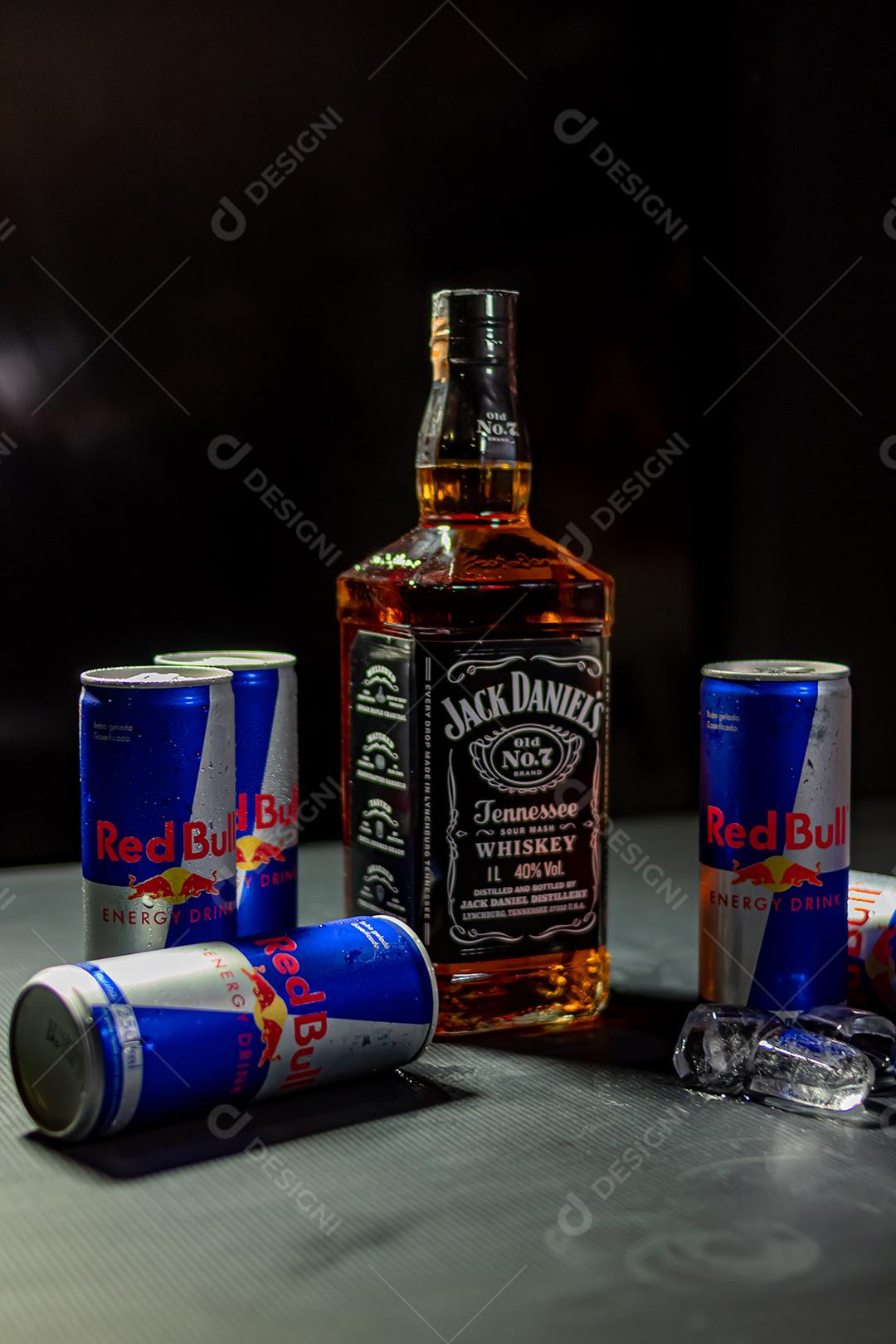 Garrafa de Uísque Jack Daniels com energetico red Bul bebida sobre ...