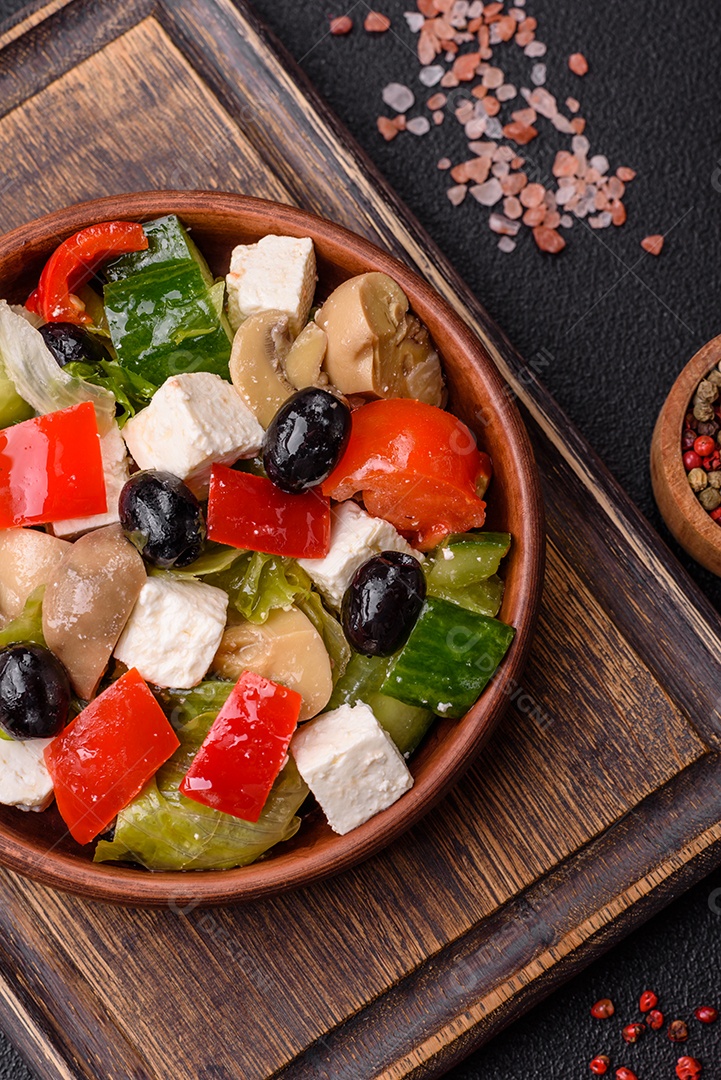 Deliciosa salada fresca e suculenta de pimentão, queijo, azeitonas, tomates, pepinos com sal e especiarias sobre um fundo escuro de concreto